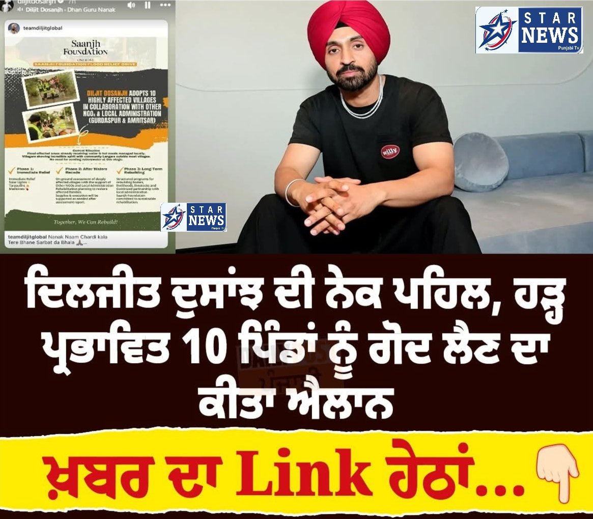 ਇਨ੍ਹਾਂ ਸਭ ਦੇ ਵਿਚਾਲੇ ਪੰਜਾਬੀ ਗਾਇਕ ਦਿਲਜੀਤ ਦੁਸਾਂਝ ਨੇ ਹੜ੍ਹ ਪੀੜਤਾਂ ਲਈ ਨੇਕ ਪਹਿਲ ਕੀਤੀ ਹੈ। ਦਿਲਜੀਤ ਦੋਸਾਂਝ ਦੇ ਸਾਂਝ ਫਾਊਂਡੇਸ਼ਨ ਨੇ ਹੜ੍ਹ ਪ੍ਰਭਾਵਿਤ 10 ਪਿੰਡਾਂ ਨੂੰ ਗੋਦ ਲੈਣ ਦਾ ਐਲਾਨ ਕੀਤਾ ਹੈ। ਫਾਊਂਡੇਸ਼ਨ ਨੇ ਐਲਾਨ ਕੀਤਾ ਹੈ ਕਿ ਉਹ ਹੋਰ ਗੈਰ-ਸਰਕਾਰੀ ਸੰਗਠਨਾਂ ਅਤੇ ਸਥਾਨਕ ਪ੍ਰਸ਼ਾਸਨ ਦੇ ਸਹਿਯੋਗ ਨਾਲ ਹੜ੍ਹ ਰਾਹਤ ਕਾਰਜਾਂ ਦੀ ਹਮਾਇਤ ਲਈ ਗੁਰਦਾਸਪੁਰ ਅਤੇ ਅੰਮ੍ਰਿਤਸਰ ਦੇ 10 ਬਹੁਤ ਪ੍ਰਭਾਵਿਤ ਪਿੰਡਾਂ ਨੂੰ ਗੋਦ ਲੈ ਰਿਹਾ ਹੈ। ਫਾਊਂਡੇਸ਼ਨ ਨੇ ਐਲਾਨ ਕੀਤਾ ਹੈ ਕਿ ਉਹ ਅੰਮ੍ਰਿਤਸਰ ਤੇ ਗੁਰਦਾਸਪੁਰ ਦੇ 10 ਪਿੰਡਾਂ ਦੀ ਦੇਖਭਾਲ ਕਰਨਗੇ।