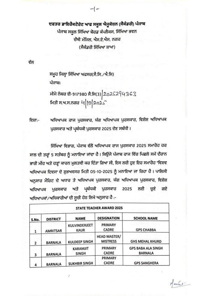 Punjab School Education Minister, S. Harjot Singh Bains, announced that 71 exceptional government teachers will be honoured with the prestigious ‘State Teacher Award 2025′ at a grand ceremony in Sri Anandpur Sahib, marking a significant celebration of World Teachers’ Day on October 5. This recognition aims to appreciate the dedication and outstanding contributions of these teachers to the state’s educational landscape.