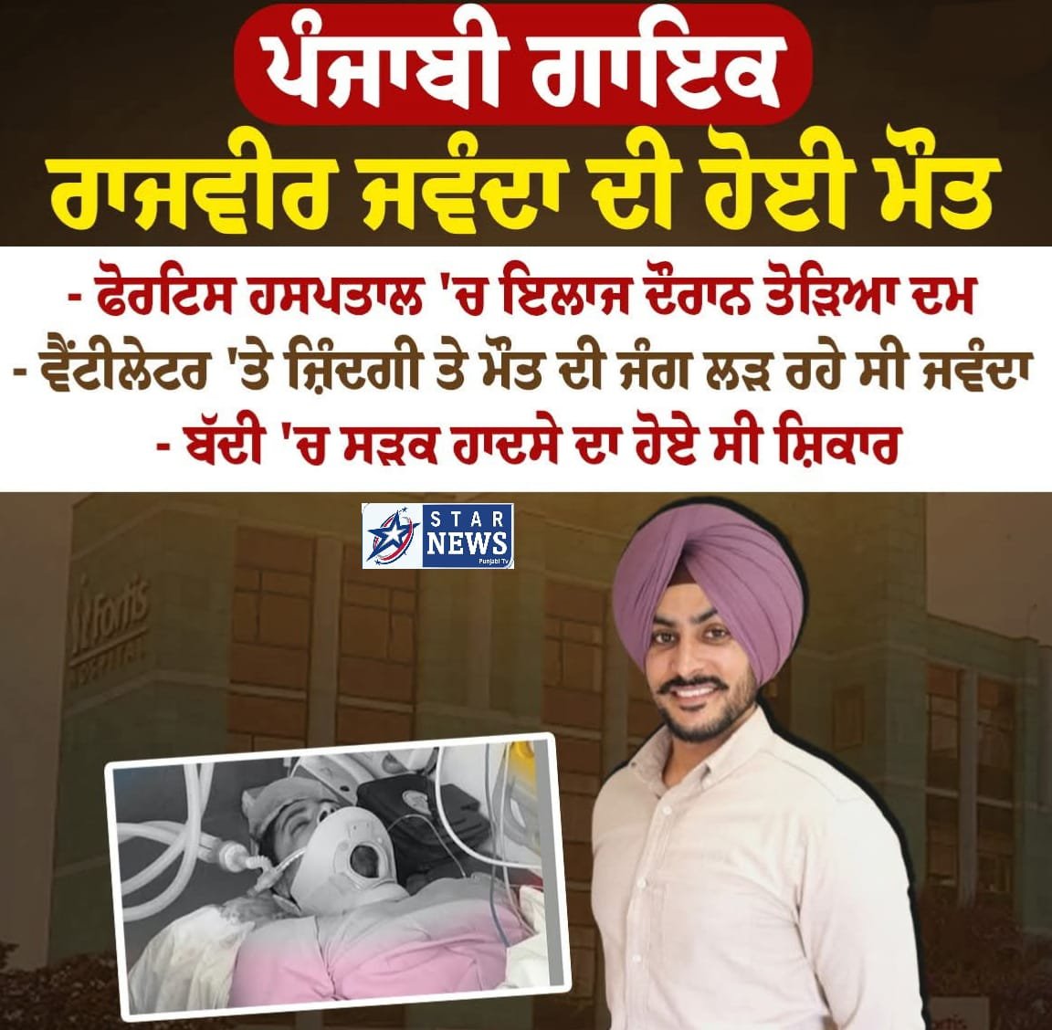 ਪੰਜਾਬੀ ਗਾਇਕ ਰਾਜਵੀਰ ਜਵੰਦਾ ਦਾ ਮੋਹਾਲੀ ਦੇ ਇੱਕ ਨਿੱਜੀ ਹਸਪਤਾਲ ਵਿੱਚ 11 ਦਿਨਾਂ ਤੱਕ ਜ਼ਿੰਦਗੀ ਅਤੇ ਮੌਤ ਦੀ ਲੜਾਈ ਲੜਨ ਤੋਂ ਬਾਅਦ ਦੇਹਾਂਤ ਹੋ ਗਿਆ ਹੈ। 35 ਸਾਲਾ ਪੰਜਾਬੀ ਗਾਇਕ ਨੂੰ ਸ਼ਨੀਵਾਰ ਨੂੰ ਹਿਮਾਚਲ ਪ੍ਰਦੇਸ਼ ਦੇ ਸੋਲਨ ਜ਼ਿਲ੍ਹੇ ਵਿੱਚ ਇੱਕ ਮੋਟਰਸਾਈਕਲ ਹਾਦਸੇ ਵਿੱਚ ਸਿਰ ਅਤੇ ਰੀੜ੍ਹ ਦੀ ਹੱਡੀ ਵਿੱਚ ਗੰਭੀਰ ਸੱਟਾਂ ਲੱਗੀਆਂ ਸਨ।