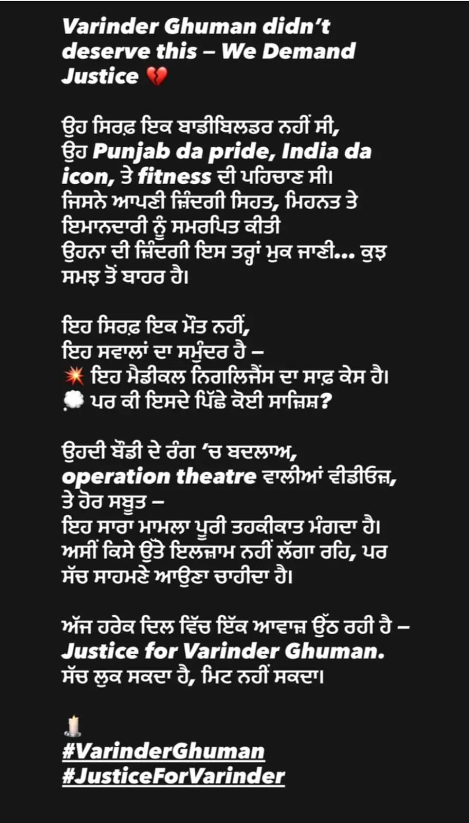 ਪਰਿਵਾਰ ਨੇ ਪੋਸਟ ਵਿੱਚ ਲਿਖਿਆ — “ਵਰਿੰਦਰ ਦੀ ਮੌਤ ਇੱਕ ਸਵਾਲ ਨਹੀਂ, ਸਵਾਲਾਂ ਦਾ ਸਮੁੰਦਰ ਹੈ। ਇਹ ਸਾਫ਼ ਤੌਰ ‘ਤੇ ਮੈਡੀਕਲ ਨੇਗਲਿਜੈਂਸੀ ਦਾ ਕੇਸ ਹੈ। ਕੀ ਇਸ ਦੇ ਪਿੱਛੇ ਕੋਈ ਵੱਡੀ ਸਾਜ਼ਿਸ਼ ਹੈ?”