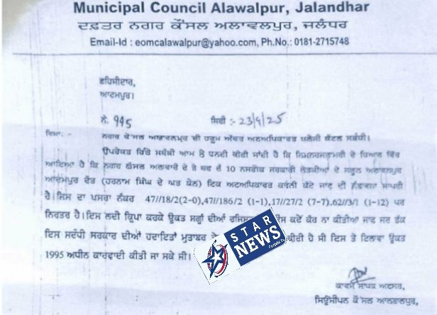 ਨਗਰ ਕੌਂਸਿਲ ਦੇ EO ਨੇ ਅਦਮਪੁਰ ਦੇ ਤੇਹਸੀਲਦਾਰ ਨੂੰ ਖ਼ਤ ਲਿਖ ਕੇ ਸਪਸ਼ਟ ਕੀਤਾ ਕਿ ਇਸ ਅਵੈਧ ਕਾਲੋਨੀ ਵਿੱਚ ਮੌਜੂਦ ਪਲਾਟਾਂ ਦੀ ਰਜਿਸਟਰੀ ਤੁਰੰਤ ਬੰਦ ਕੀਤੀ ਜਾਵੇ। ਇਸ ਦੇ ਨਾਲ ਹੀ ਕਾਲੋਨੀ ਵਿੱਚ ਜ਼ਮੀਨ ਖਰੀਦਣ ਜਾਂ ਵੇਚਣ ‘ਤੇ ਸਖ਼ਤ ਰੋਕ ਲਾ ਦਿੱਤੀ ਗਈ ਹੈ। ਇਸ ਕਾਰਵਾਈ ਨਾਲ ਸਪੱਸ਼ਟ ਹੋ ਗਿਆ ਹੈ ਕਿ ਕੋਈ ਵੀ ਵਿਅਕਤੀ ਹੁਣ ਇਸ ਅਵੈਧ ਕਾਲੋਨੀ ਵਿੱਚ ਪਲਾਟ ਖਰੀਦ ਨਹੀਂ ਸਕਦਾ, ਅਤੇ ਜੇ ਕੋਈ ਇਹਦਾ ਉਲੰਘਣ ਕਰਦਾ ਹੈ, ਤਾਂ ਉਸ ਦੇ ਖ਼ਿਲਾਫ਼ ਕਾਨੂੰਨੀ ਕਾਰਵਾਈ ਕੀਤੀ ਜਾਵੇਗੀ।