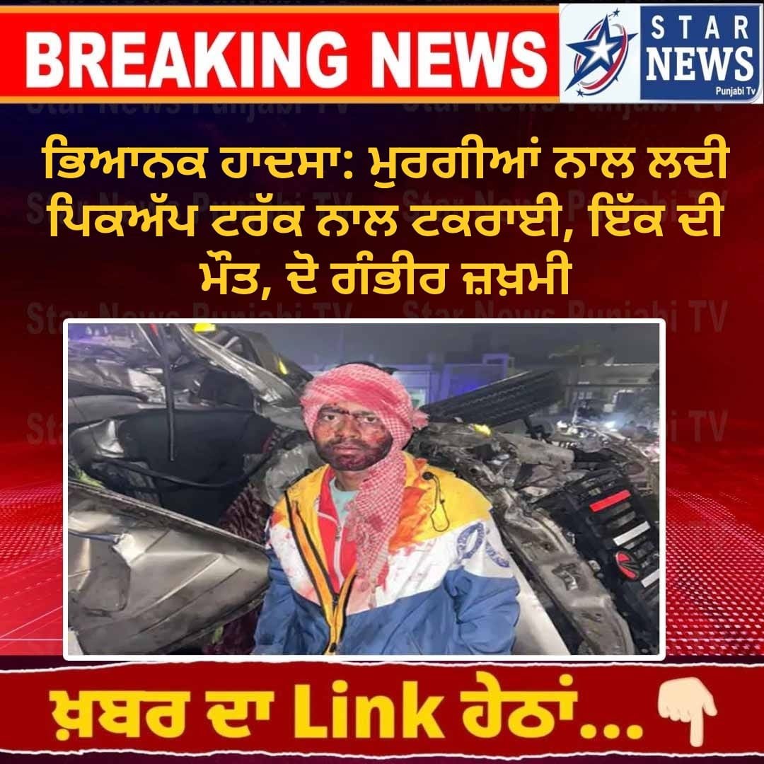 ਜਲੰਧਰ (ਪੰਕਜ ਸੋਨੀ / ਹਨੀ ਸਿੰਘ ) ਜਲੰਧਰ ਵਿੱਚ ਘਣੇ ਕੋਹਰੇ ਕਾਰਨ ਸੜਕ ਹਾਦਸਿਆਂ ਦੀ ਗਿਣਤੀ ਲਗਾਤਾਰ ਵੱਧ ਰਹੀ ਹੈ। ਤਾਜ਼ਾ ਮਾਮਲਾ ਜਲੰਧਰ ਦੇ ਨੇਸ਼ਨਲ ਹਾਈਵੇ ‘ਤੇ ਪਿੰਡ ਚਚਰਾਡੀ ਦੇ ਨੇੜੇ ਸਾਹਮਣੇ ਆਇਆ, ਜਿੱਥੇ ਮੁਰਗੀਆਂ ਨਾਲ ਭਰੀ ਇੱਕ ਪਿਕਅੱਪ ਗੱਡੀ ਅਤੇ ਟਰੱਕ ਵਿਚਕਾਰ ਭਿਆਨਕ ਟੱਕਰ ਹੋ ਗਈ। ਇਸ ਹਾਦਸੇ ਵਿੱਚ ਇੱਕ ਵਿਅਕਤੀ ਦੀ ਮੌਕੇ ‘ਤੇ ਹੀ ਮੌਤ ਹੋ ਗਈ, ਜਦਕਿ ਦੋ ਹੋਰ ਲੋਕ ਗੰਭੀਰ ਰੂਪ ਵਿੱਚ ਜ਼ਖ਼ਮੀ ਹੋ ਗਏ।