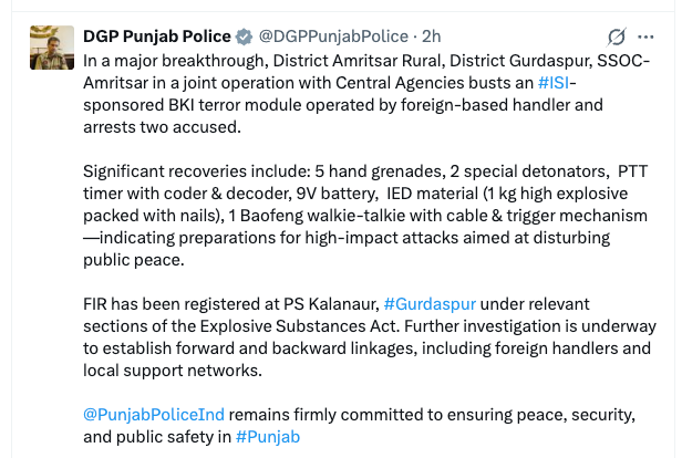 ਇੱਕ ਵੱਡੀ ਸਫਲਤਾ ਹਾਸਲ ਕਰਦਿਆਂ ਜ਼ਿਲ੍ਹਾ ਅੰਮ੍ਰਿਤਸਰ ਦੇਹਾਤੀ, ਜ਼ਿਲ੍ਹਾ ਗੁਰਦਾਸਪੁਰ ਅਤੇ SSOC ਅੰਮ੍ਰਿਤਸਰ ਨੇ ਕੇਂਦਰੀ ਏਜੰਸੀਆਂ ਨਾਲ ਮਿਲ ਕੇ ਸਾਂਝੇ ਆਪਰੇਸ਼ਨ ਦੌਰਾਨ ISI ਪ੍ਰਾਯੋਜਿਤ BKI ਆਤੰਕੀ ਮੋਡੀਊਲ ਦਾ ਪਰਦਾਫਾਸ਼ ਕੀਤਾ ਹੈ। ਇਸ ਕਾਰਵਾਈ ਦੌਰਾਨ ਦੋ ਦੋਸ਼ੀਆਂ ਨੂੰ ਗ੍ਰਿਫ਼ਤਾਰ ਕੀਤਾ ਗਿਆ ਹੈ।
