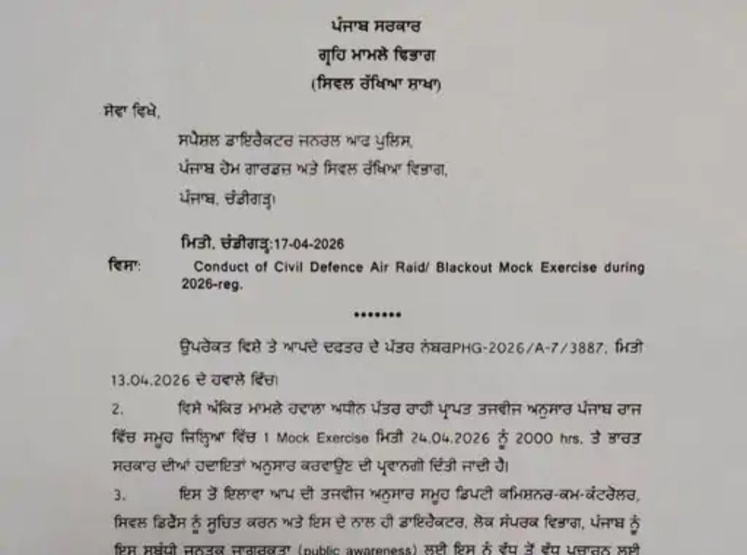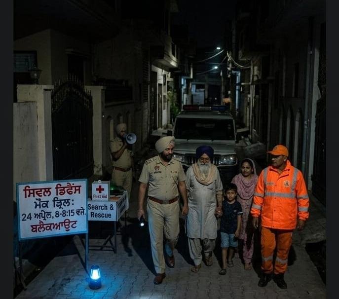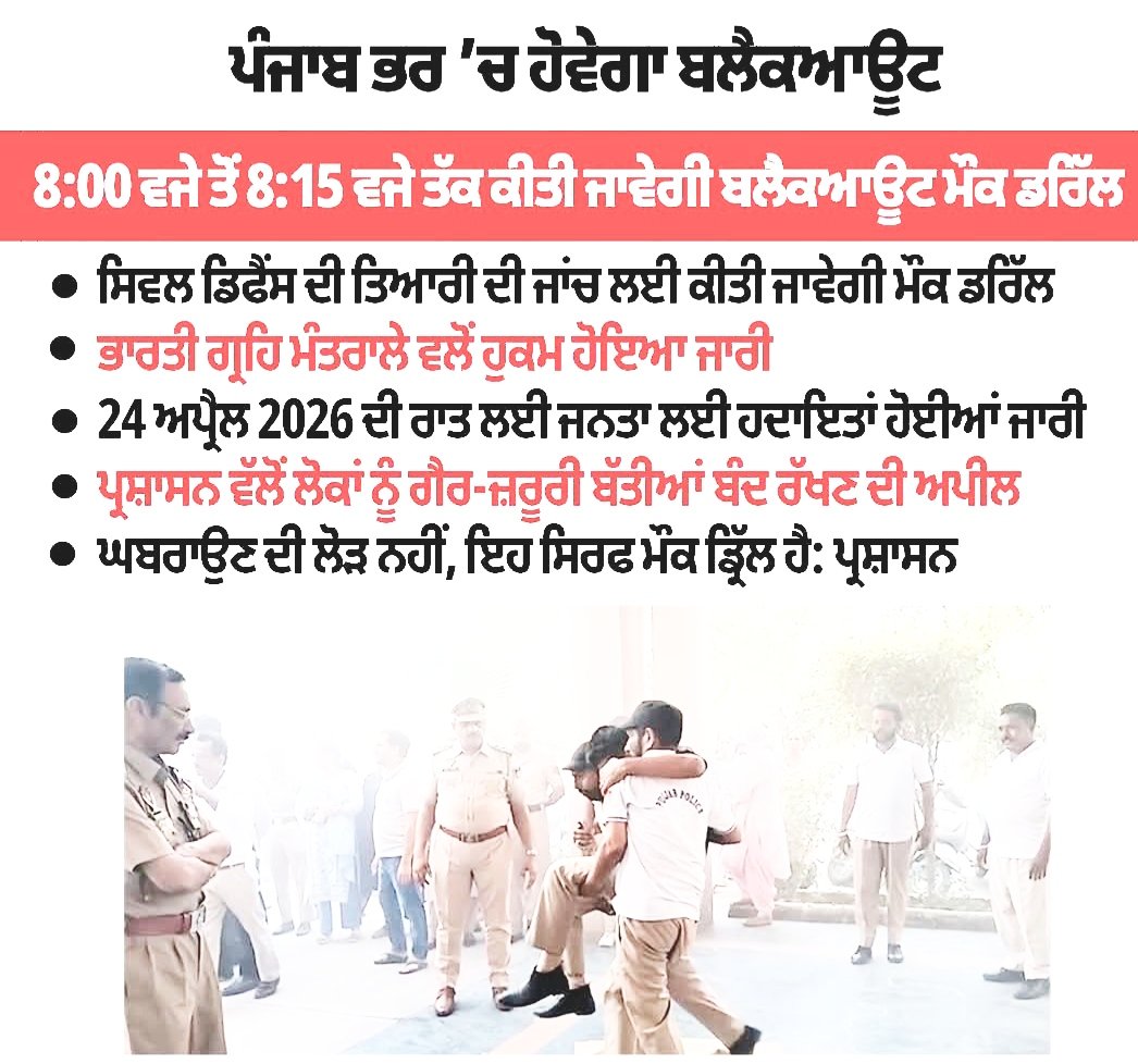 ਪੰਜਾਬ (ਪੰਕਜ਼ ਸੋਨੀ/ਹਨੀ):-ਪੰਜਾਬ ਸਰਕਾਰ ਵੱਲੋਂ ਰਾਜ ਵਿੱਚ ਜੰਗ ਵਰਗੀ ਕਿਸੇ ਵੀ ਐਮਰਜੈਂਸੀ ਸਥਿਤੀ ਨਾਲ ਨਜਿੱਠਣ ਦੀਆਂ ਤਿਆਰੀਆਂ ਨੂੰ ਪਰਖਣ ਲਈ **24 ਅਪ੍ਰੈਲ 2026** ਨੂੰ ਪੂਰੇ ਸੂਬੇ ਵਿੱਚ ਇੱਕ ਵਿਸ਼ੇਸ਼ ‘ਮੌਕ ਡ੍ਰਿਲ’ (ਅਭਿਆਸ) ਕਰਵਾਈ ਜਾ ਰਹੀ ਹੈ। ਕੇਂਦਰੀ ਗ੍ਰਹਿ ਮੰਤਰਾਲੇ ਦੇ ਨਿਰਦੇਸ਼ਾਂ ‘ਤੇ ਹੋਣ ਵਾਲੀ ਇਸ ਕਵਾਇਦ ਦੌਰਾਨ ਪੂਰੇ ਪੰਜਾਬ ਵਿੱਚ **ਰਾਤ 8:00 ਵਜੇ ਤੋਂ 8:15 ਵਜੇ ਤੱਕ (15 ਮਿੰਟ ਲਈ)** ਮੁਕੰਮਲ ‘ਬਲੈਕਆਊਟ’ ਰਹੇਗਾ।