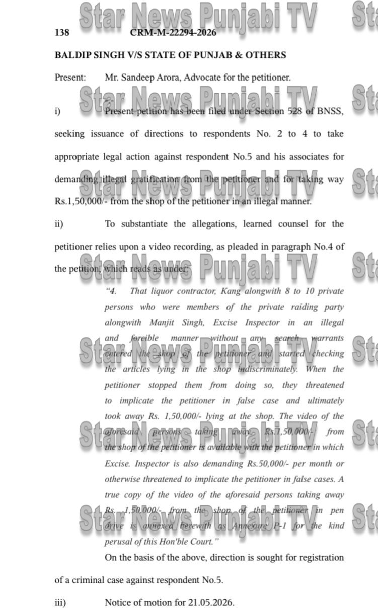 ਪਟੀਸ਼ਨਰ ਨੇ ਇਹ ਵੀ ਆਰੋਪ ਲਗਾਇਆ ਹੈ ਕਿ ਇਸ ਦੌਰਾਨ ਦੁਕਾਨ ਵਿੱਚੋਂ ₹1,50,000 ਨਕਦ ਰਕਮ ਲੈ ਲਈ ਗਈ। ਨਾਲ ਹੀ, ਐਕਸਾਈਜ਼ ਇੰਸਪੈਕਟਰ ਮਨਜੀਤ ਸਿੰਘ ‘ਤੇ ਹਰ ਮਹੀਨੇ ₹50,000 ਦੀ ਗੈਰਕਾਨੂੰਨੀ ਵਸੂਲੀ ਦੀ ਮੰਗ ਕਰਨ ਦੇ ਵੀ ਦੋਸ਼ ਲਗਾਏ ਗਏ ਹਨ।